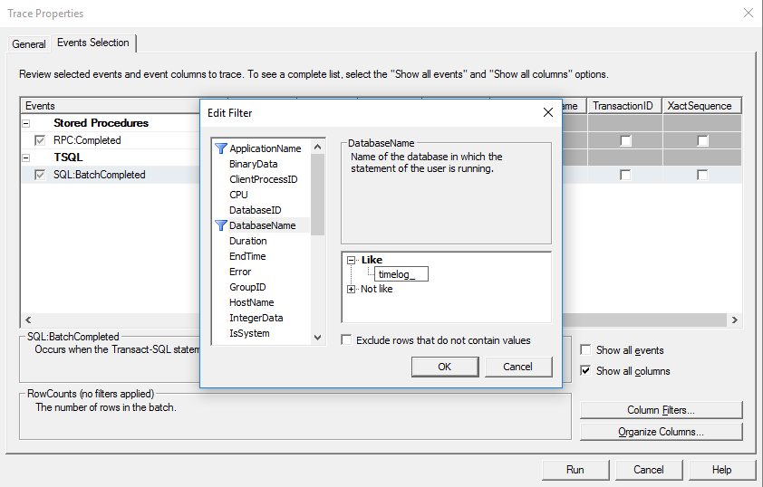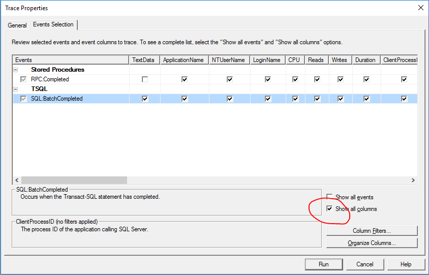 Connect the profiler to the database server and customize the included events as shown below. Only Stored Procedures and TSQL completed events should be necessary for this. Click the “Show all columns” checkbox and find the column with “Row counts” as this might be usefull in order to find the queries taking up time.