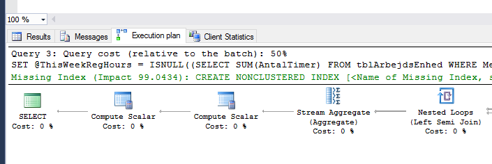Additionally, look in the “Execution Plan” tab. Look through each of the inline parts and look for large graphs and in them look for the element with the highest cost percent. Also, you want to look for “Missing Index” notes. If it appears, right click that line and choose the “Missing Index Details…”. Examine the index and the fields it includes. Give it a name and try adding it, then profile again.